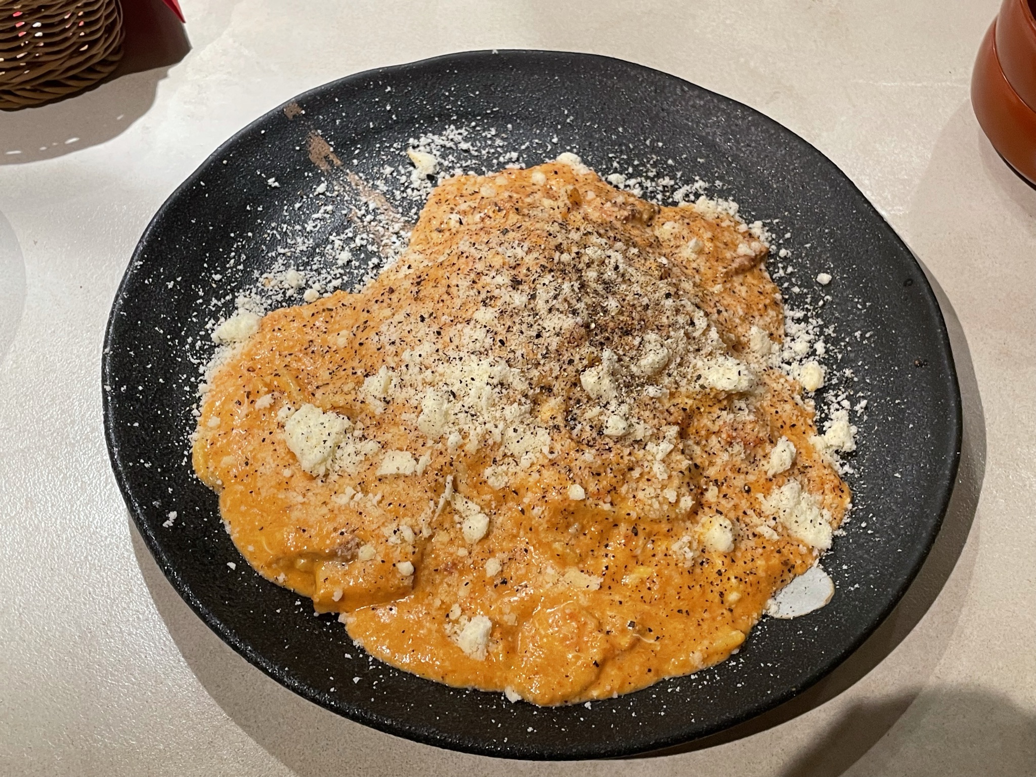 さらに追加でパスタをお願いしました。美味しい柚子胡椒が手に入ったとのことで、オイル系かクリーム系か聞かれたのでクリーム系のパスタを選択。ソースまで美味しかったのでバケットを追加。